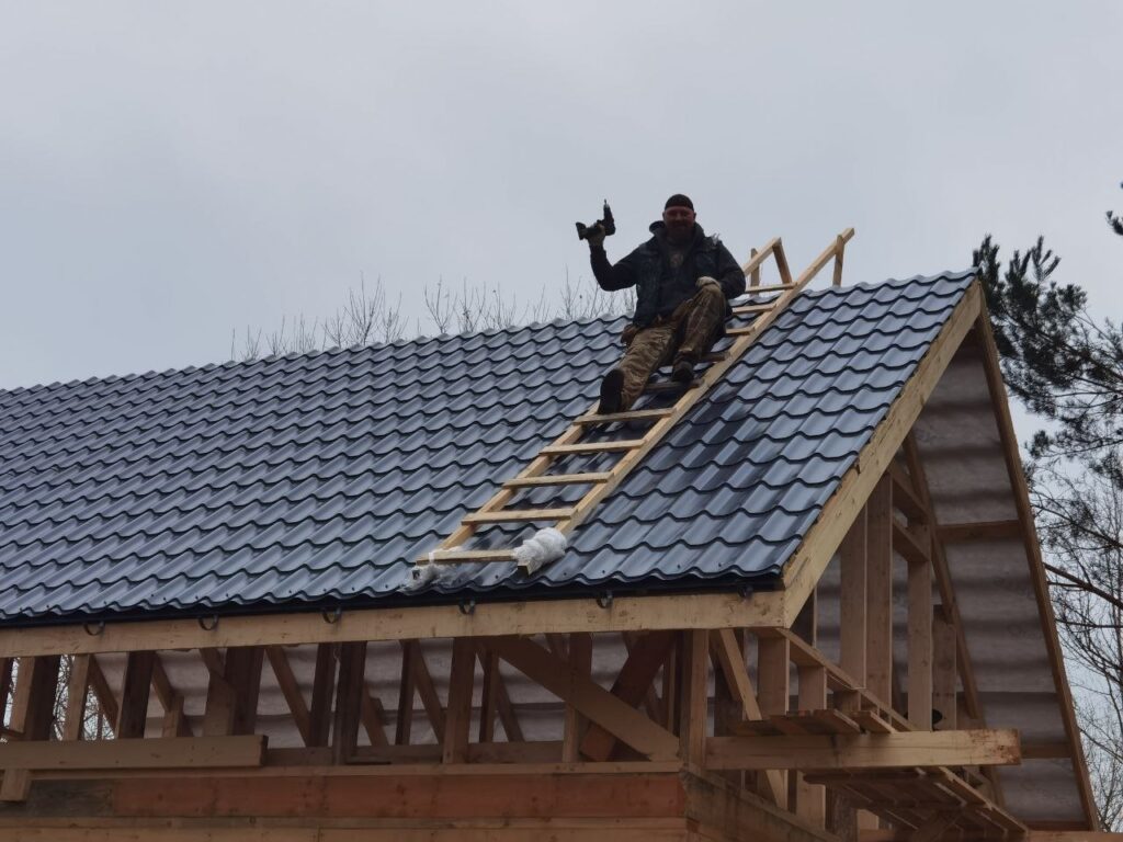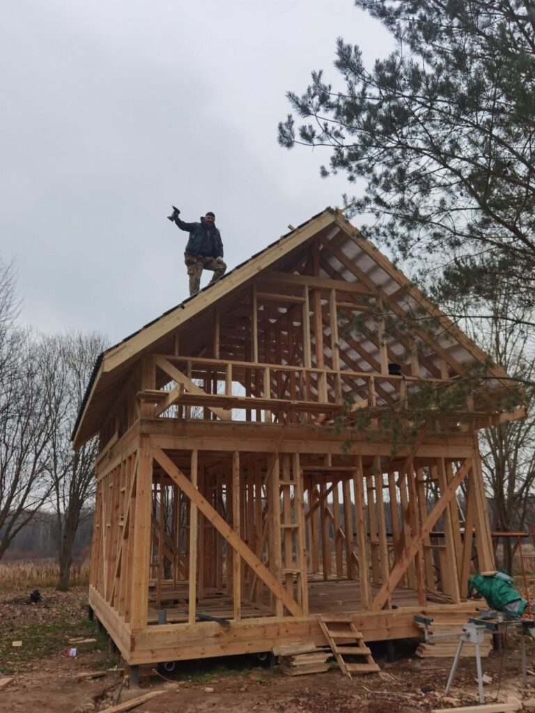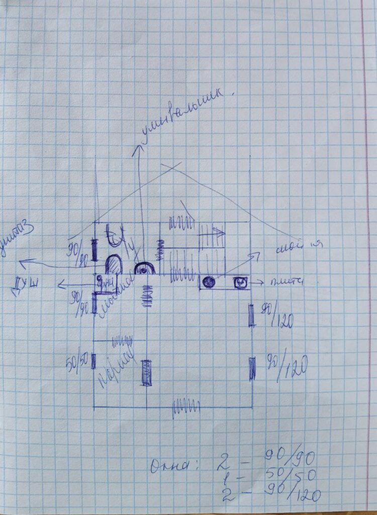 Строить начали в 2023 году. Муж решил начать с бани-гостевого домика. Чертеж на листе бумаги в клеточку превратился спустя два месяца вот в это.